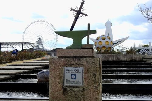 万博記念公園の日本庭園の前には、こんなんがあります。 暖冬とは云え、この時期にバラは咲いてへんやろ、と思ったのですが、目の前にはこのやうな光景が、 1月31日ですが、バラが元気に咲いています!ちなみに、右の上が、日本庭園の入り口です。 反対側…