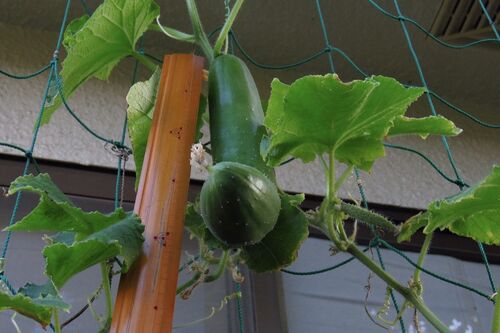 梅雨も明け、連日猛暑が続いていて何処にも出掛けずに、怠惰な日を過ごしています。当然、写真を撮る気もせず、庭の写真ばかりを撮っていたりします(^_^*) と云うわけで、先日貼ったばかりのこのキュウリ、 昨日収穫してみました。25センチくらいに育って…