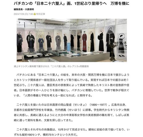 7月も今日を入れてあと2日、明後日は8月です。そんな中、一昨日、日曜日のAサヒのデヂタル版にこのやうな記事が、 前日の夕刊にも載っていましたが、来年開催される予定の関西万博のバチカン館(?)に『日本26聖人』の原画が展示されるとの記事ですが…